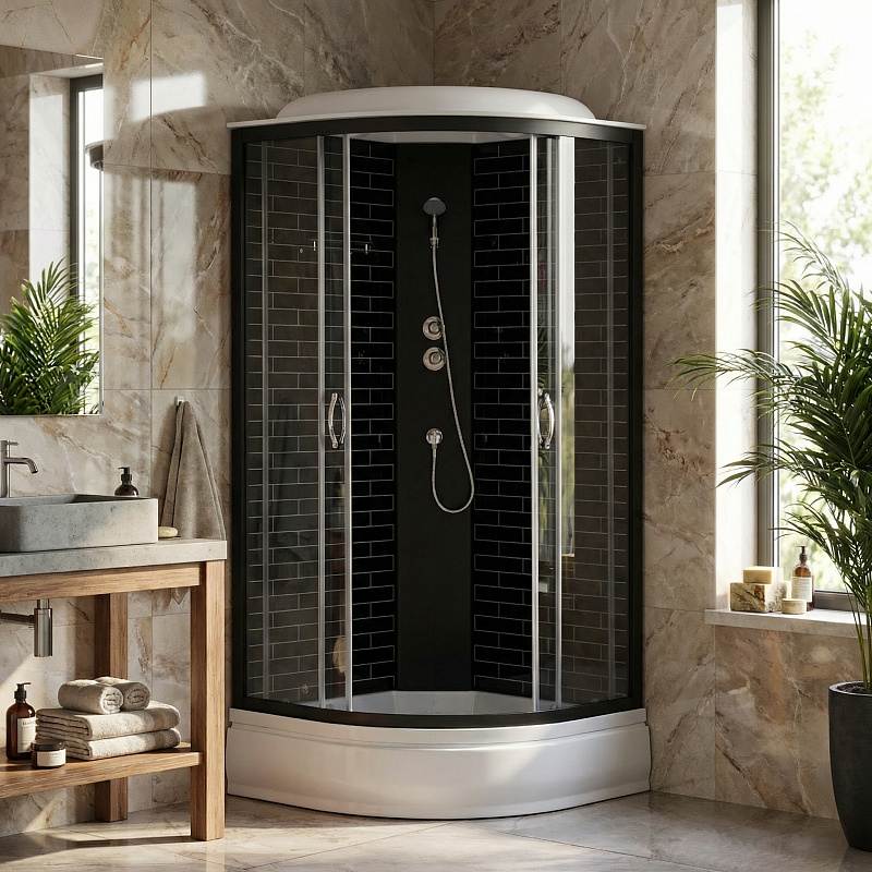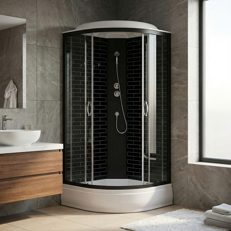 —Душевая кабина Loranto 90х90х215 поддон 25 см, черный кирпичный узор, серое стекло 4мм, профиль черный (CS-6690-25GB 90)