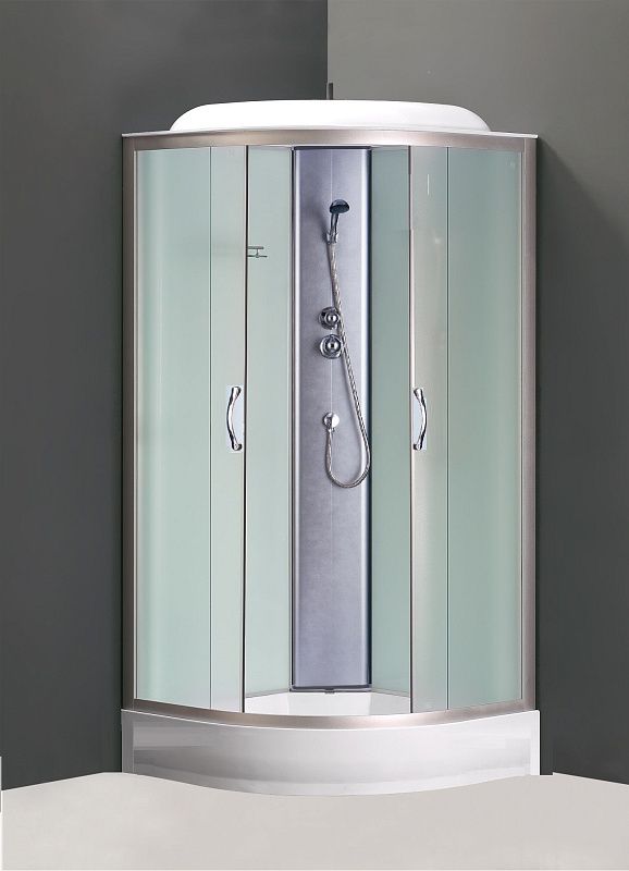 Кабина выполнена в универсальном дизайне с премиальными материалами: матовое стекло дверей создаёт эффект мягкого рассеянного света, а задняя стенка из стекла визуально расширяет пространство. Профиль из алюминия в матовом хроме придаёт конструкции прочность и элегантную завершённость.