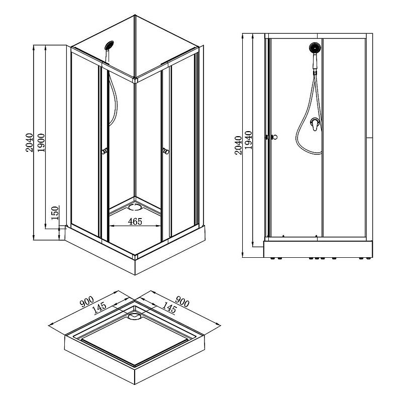 CS-21801Душевая кабина  90x90x(190+15)см c низким поддоном 15см, прозрачное закаленное стекло 5 мм, задние стеклянные стенки БЕЛЫЕ, профиль черный-мат., черный  ручной душ + шланг для душа + черный держатель (3 места)