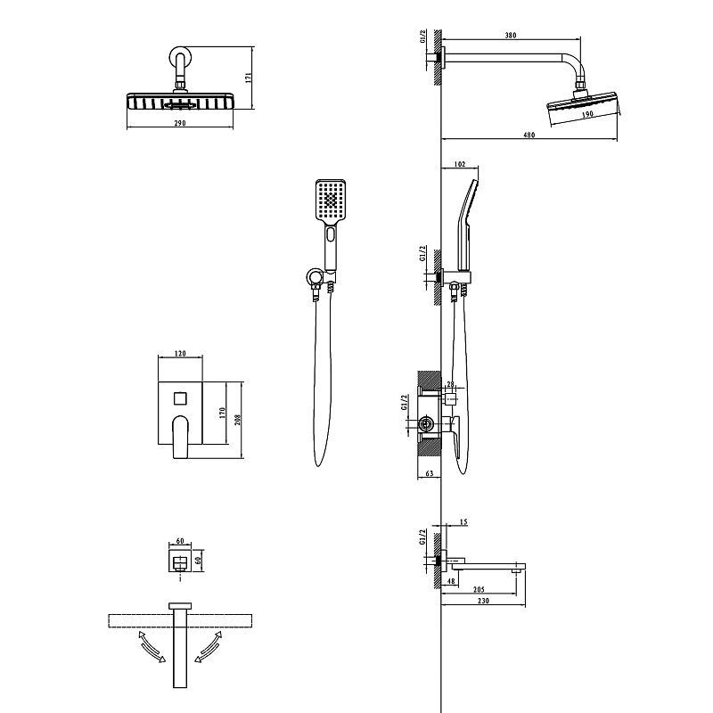 верхний душ#душевая лейка#душевой шланг#держатель для душевой лейки#панель смесителя#смеситель#скрытая монтажная часть#шланговое подключение