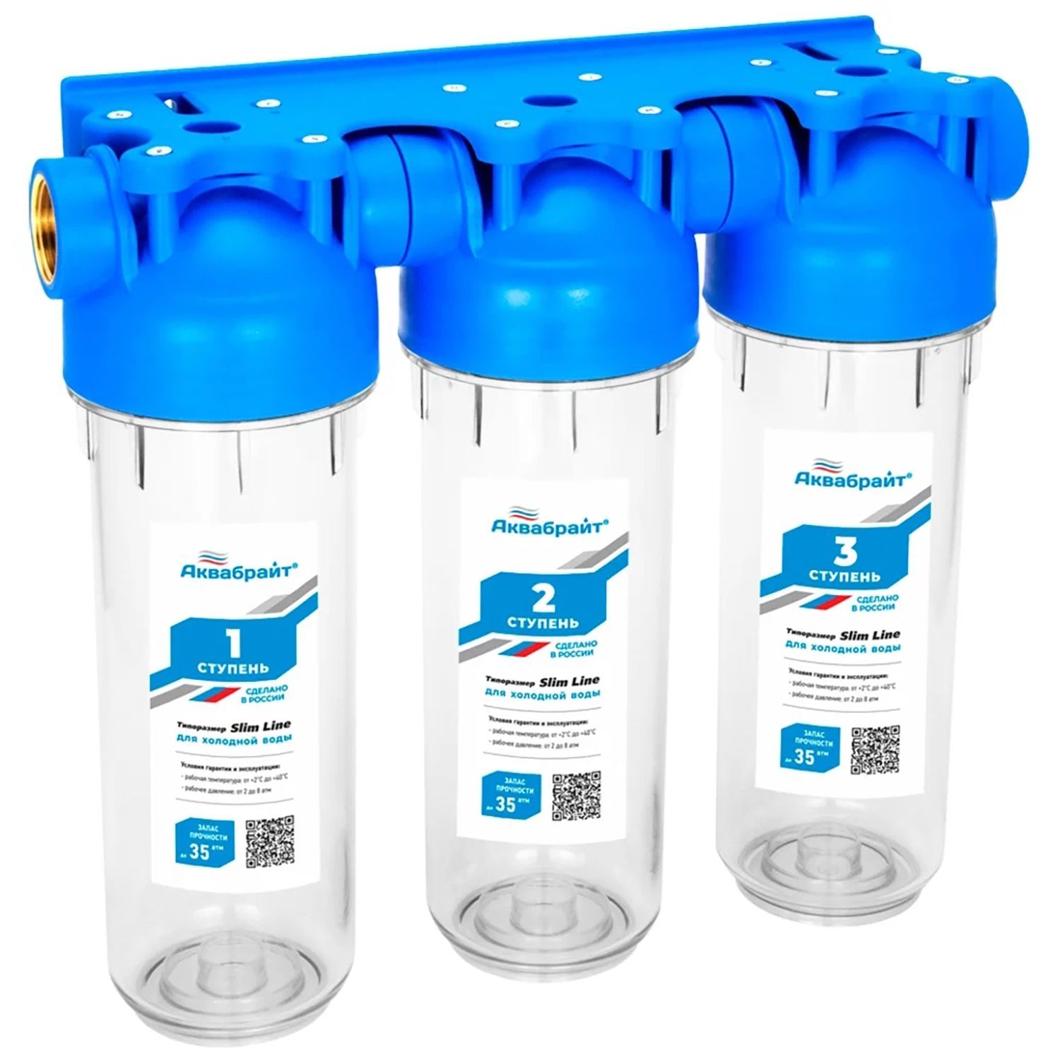 —Фильтр для воды АКВАБРАЙТ магистральный, 1/2 ", 3-х ступенчатый, прозрачные корпуса, Slim Line 10, в комплекте кронштейн и ключ (АБФ-3 1/2)