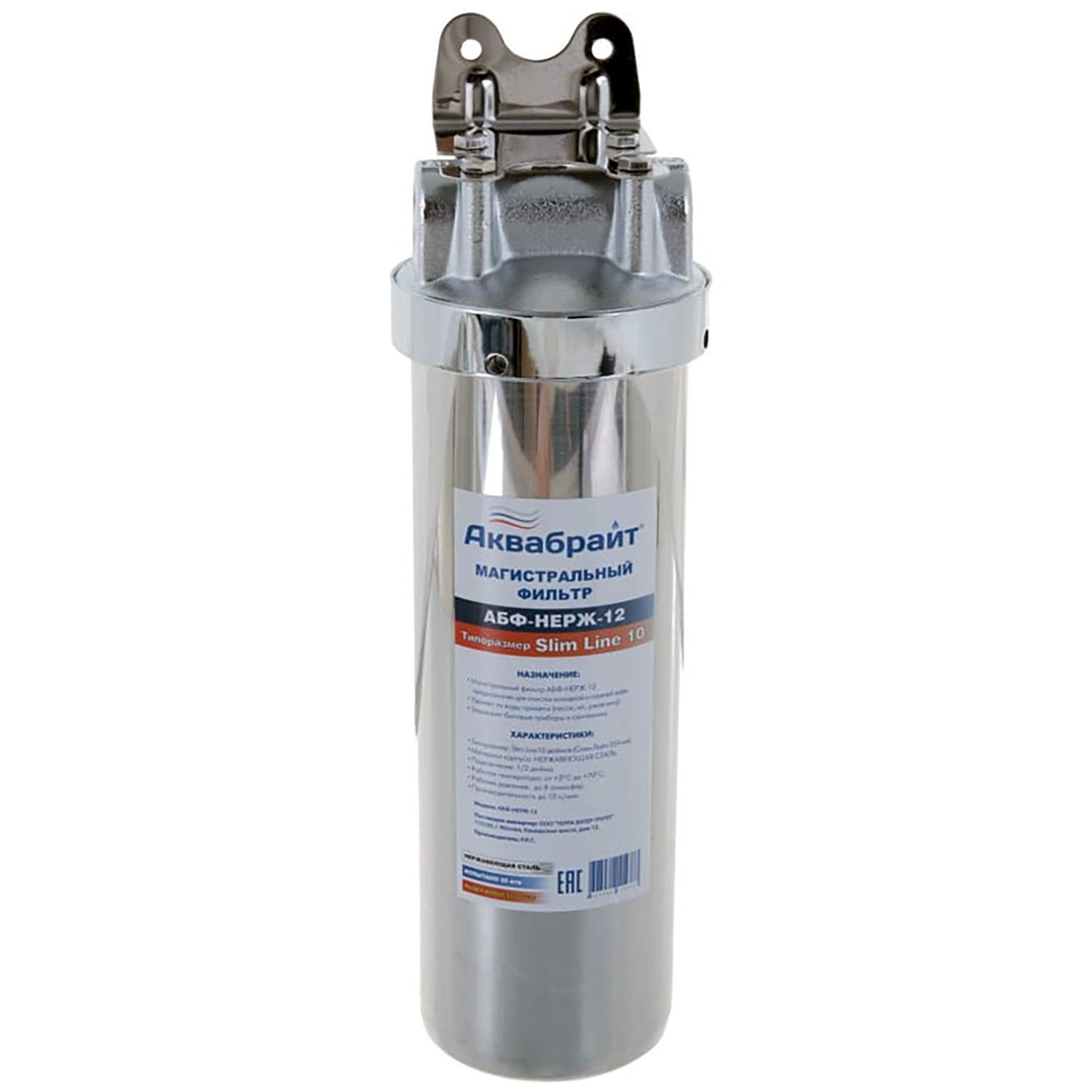 —Фильтр для воды АКВАБРАЙТ магистральный, 1/2", корпус из нержавеющей стали, Slim Line 10", в комплекте кронштейн и ключ (АБФ-НЕРЖ-12)