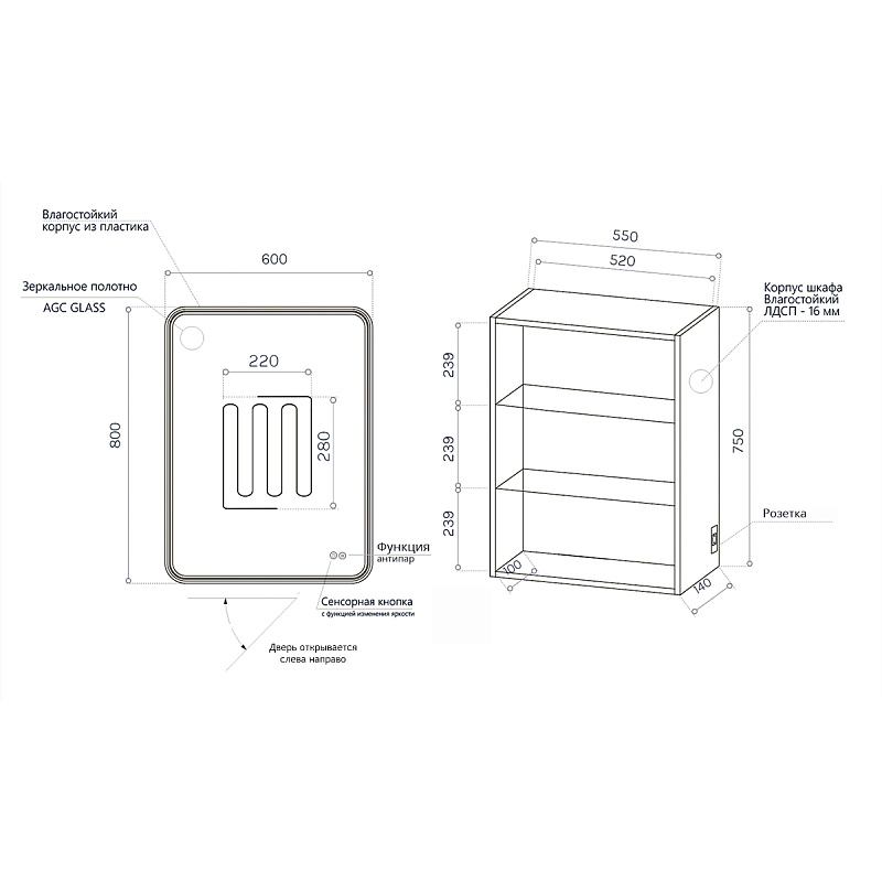 —Зеркальный шкаф AZARIO 600*800 правосторонний, с подсветкой+подогрев "Air", сенсорный выключатель (CS00084317)