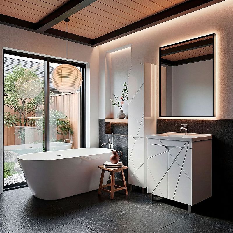 Модели одного комплекта (набора) мебели Оптимум выполнены в едином архитектурно-художественном и конструктивно-технологическом решении. Фасады имеют геометрическую фрезеровку с встроенной ручкой. Классический конструктив тумб под раковину с двумя дверцами и полкой позволяет удобно разместить бытовую химию, косметические средства и все необходимое.