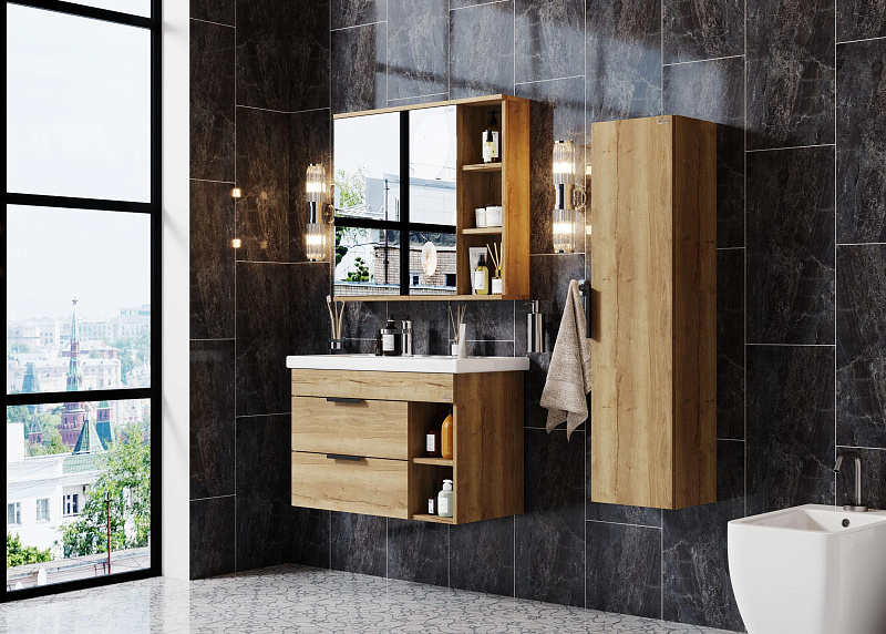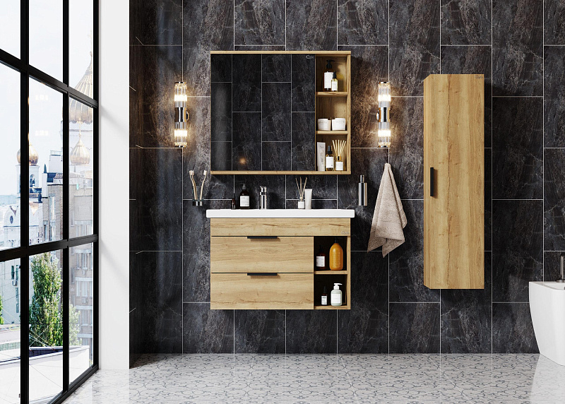 Подвесная тумба Onika ЛЕГРАН 80.13 - это сочетание насыщенного древесного декора и благородства металла: роскошная текстура и натуральный цвет дуба дают теплоту, а матовые металлические ручки добавляют урбанизма и солидности.