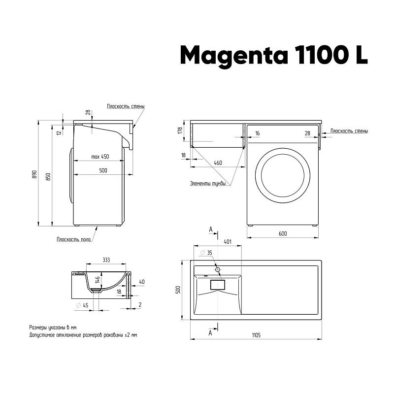 Раковина-столешница универсальная Paola Magenta 1100 L (левая чаша) для подвесной установки над стиральной машиной и частично на тумбу. Современная, стильная, эргономичная, позволяет экономить площадь ванной комнаты, так как под столешницу прекрасно впишется стиральная машина. Также возможен монтаж раковины полностью на тумбу вровень. Раковина выполнена из прочного износостойкого литьевого мрамора, сверху покрыта специальным защитным покрытием гелькоутом. Исполнение поверхности Glossy Shine - изделие обладает глянцевым блеском, очень приятное на ощупь, прочное. Даже при минимальном уходе долго сохраняет безупречный цвет и внешний вид. В комплекте - правый кронштейн с крепежом, выпуск и декоративный элемент, под которой спрятан слив,  технический паспорт и гарантийный талон. Заводская гарантия составляет 5 лет, срок службы более 10