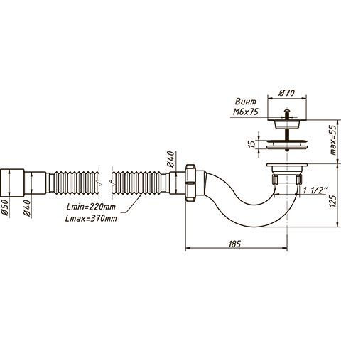 В комплекте идёт полированная нержавеющая чашка д.70мм. Сифон комплектуется нержавеющим винтом длиной 55мм и нержавеющей гайкой М6. Прокладка бабочка на слив сделана из качественного материала ТЭП. Литая конструкция сифона самоочищающаяся и позволяет добиться максимальной скорости слива воды. Гибкий отвод позволяет подключить слив сифона к канализации с диаметрами 40 или 50мм.