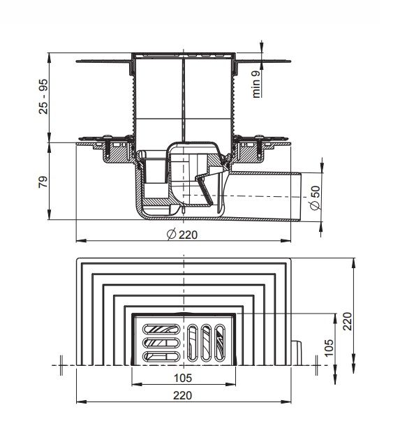 Сливной трап 105 × 105/50, подводка – боковая, решетка – нержавеющая сталь, фланец –нержавеющая сталь, воротник – 2–х уровневая изоляция, гидрозатвор – комбинированный гидрозатвор SMART