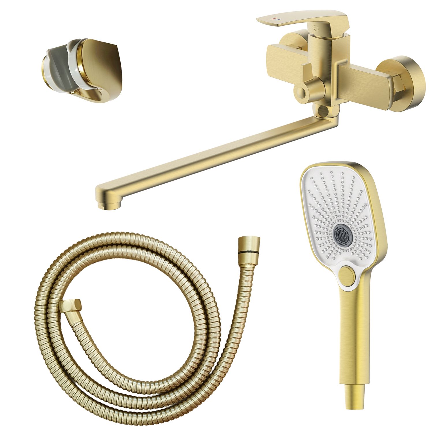 Смеситель для ванны Azario Conda керамический картридж, длинный излив, с ручным душем, шланг 150 см, золото матовое (AZ-K1711MG)