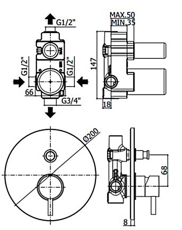 Смеситель встраиваемый для душа  на 2 выход с накладкой из металла диам.200мм, девиатор-кнопка,Черный матовый