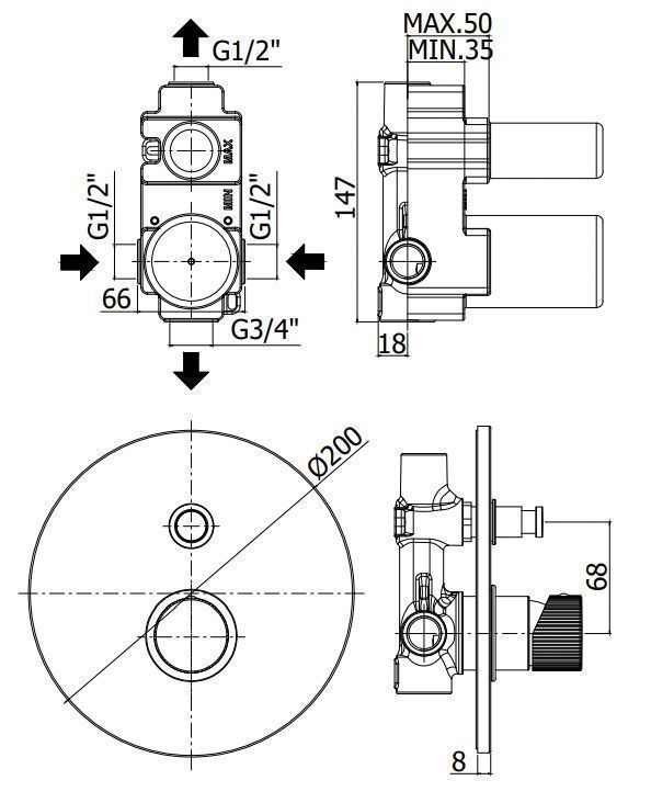 (2 выхода) в комплекте с накладкой Ø200мм из металла, встраиваемая часть в комплекте, девиатор кнопочный
