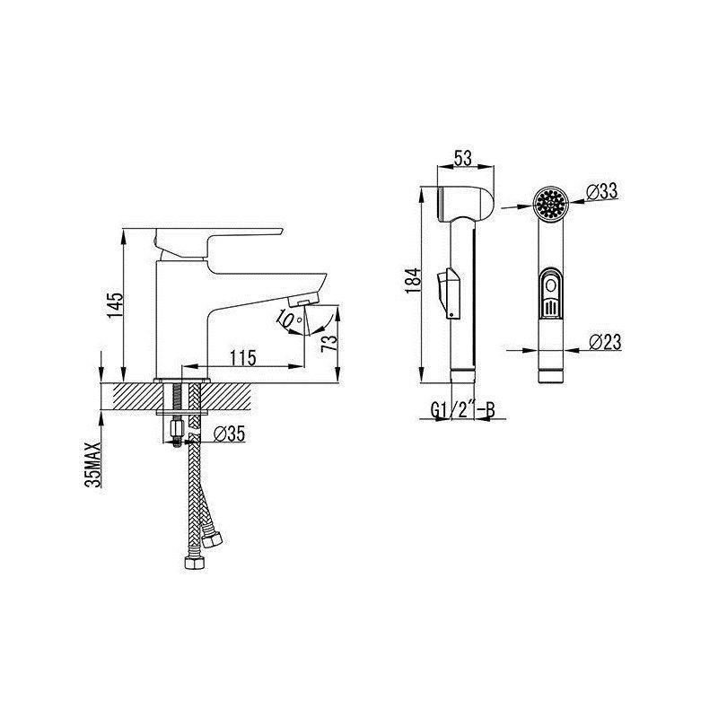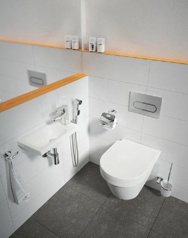 Смеситель для умывальника с гигиеническим душем и настенным держателем подходит ко всем умывальникам.
