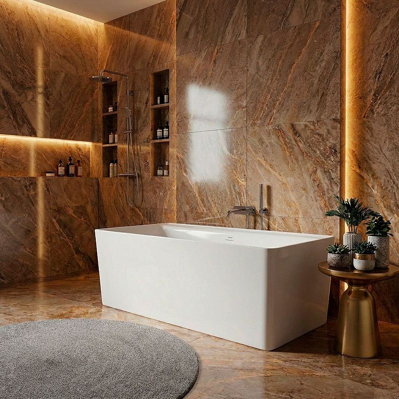 Отдельностоящая конструкция ванны придаёт интерьеру элегантность и современный вид, позволяя разместить её в любом удобном месте. В комплект входит металлическая рама, обеспечивающая надёжную поддержку и устойчивость, а также сифон, который гарантирует эффективный слив воды и простоту монтажа.