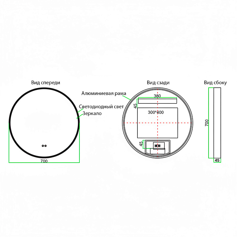 •    Алюминиевый корпус серого матового цвета: Прочный и стильный алюминиевый корпус обеспечивает долговечность и придает зеркалу элегантный, современный вид.