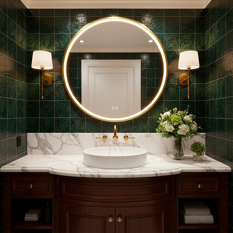 •    Алюминиевый корпус золотого матового цвета: Прочный и стильный алюминиевый корпус обеспечивает долговечность и придает зеркалу элегантный, современный вид.